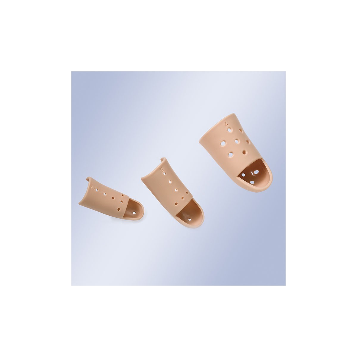 La férula está fabricada en polipropileno (color carne). La parte inferior abarca desde la zona distal del dedo hasta sobrepasar la articulación interfalángica distal, tiene forma de dedal para alojar la yema del dedo. La parte superior, solidaria a la inferior, deja libre la zona de la uña y llega hasta la articulación interfalángica distal.