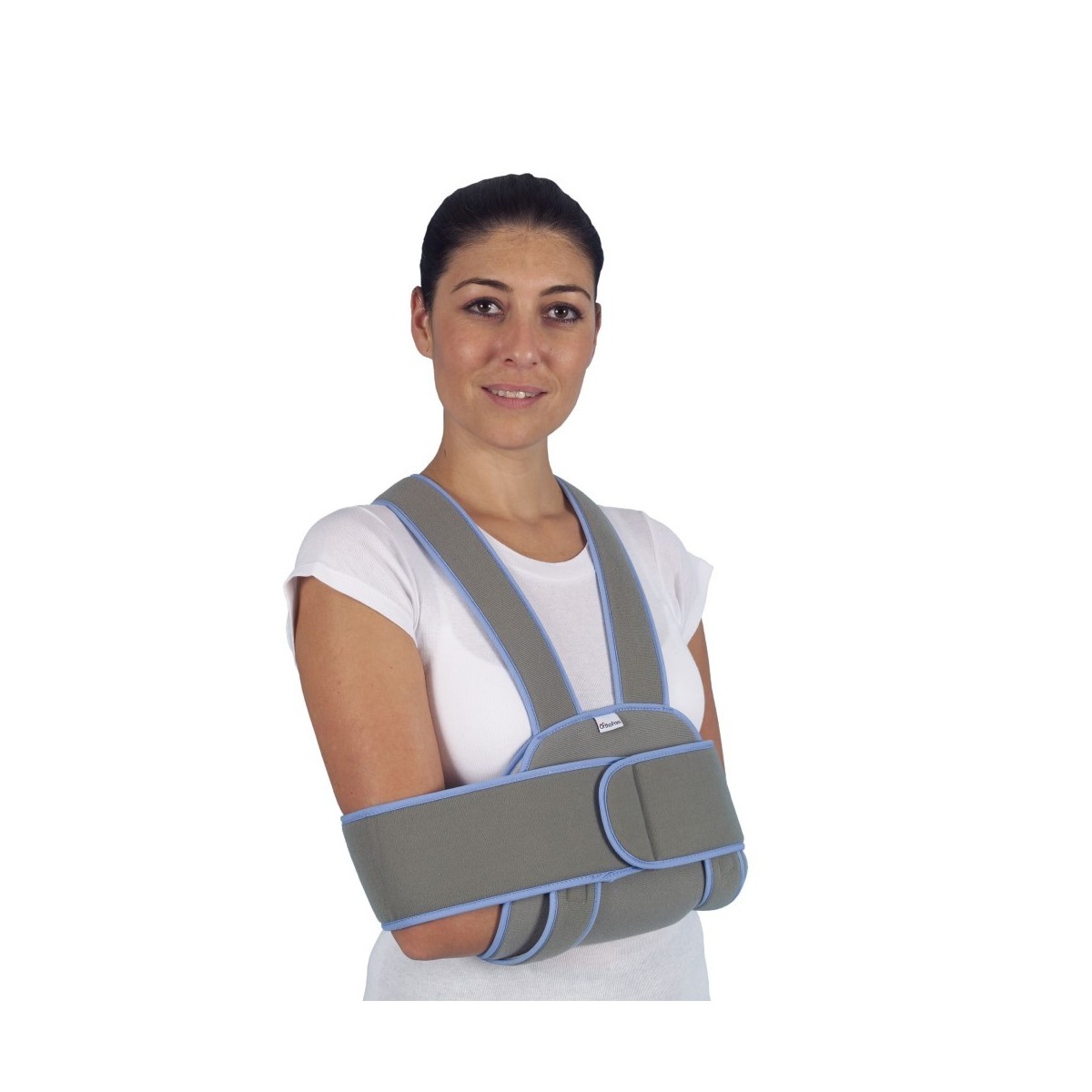 Órtesis de inmovilización que permite el descanso de la articulación escapulo-humeral. Tirantes cruzados en la espalda que aumentan la sujección y el confort. Cuenta con una banda ancha que garantiza una adecuada inmovilización del hombro. Latex Free. No guarda lado.