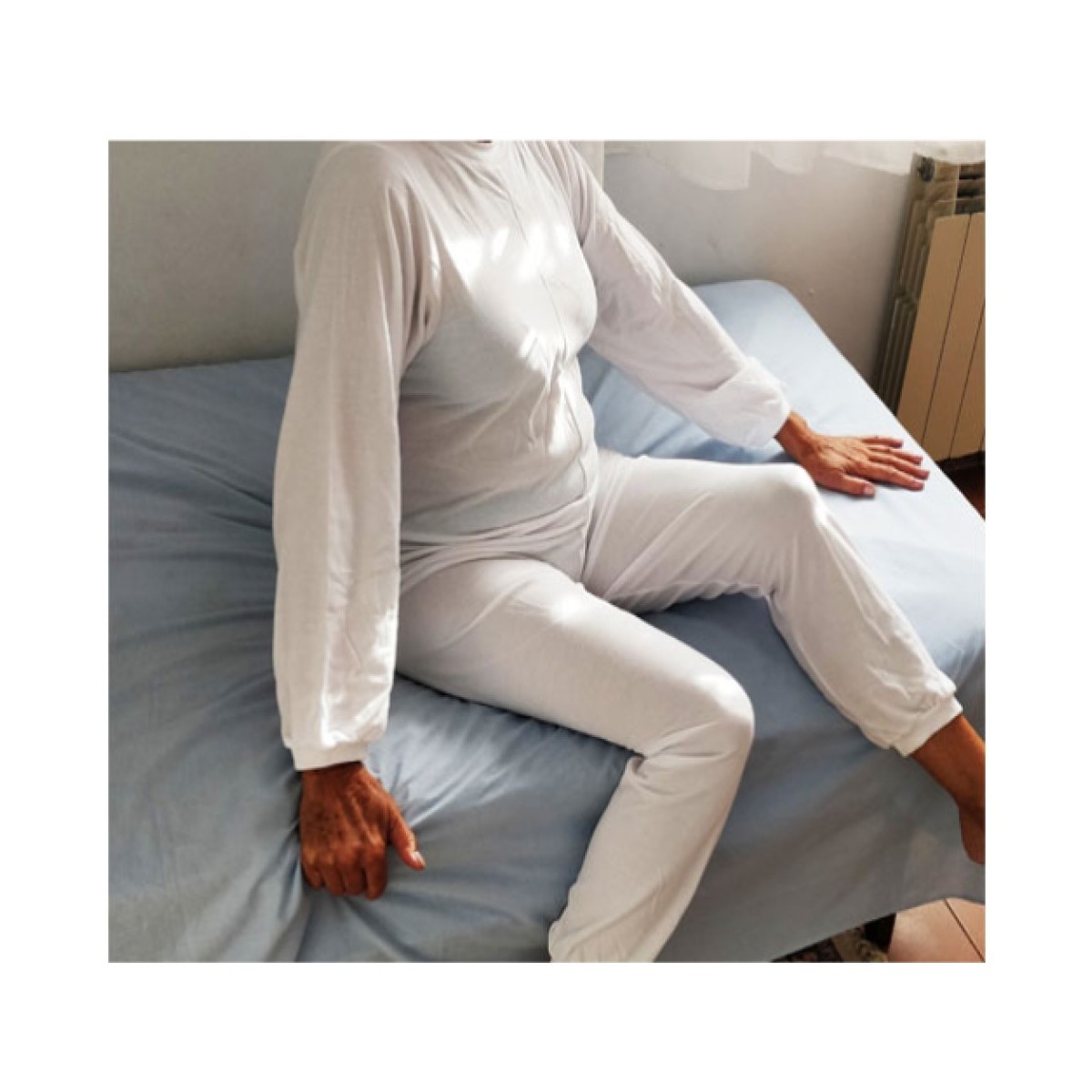 Sus cremalleras facilitan que el personal auxiliar pueda vestirle y desnudarle cómodamente. La camiseta se fija al pantalón por medio de otra cremallera transversal.