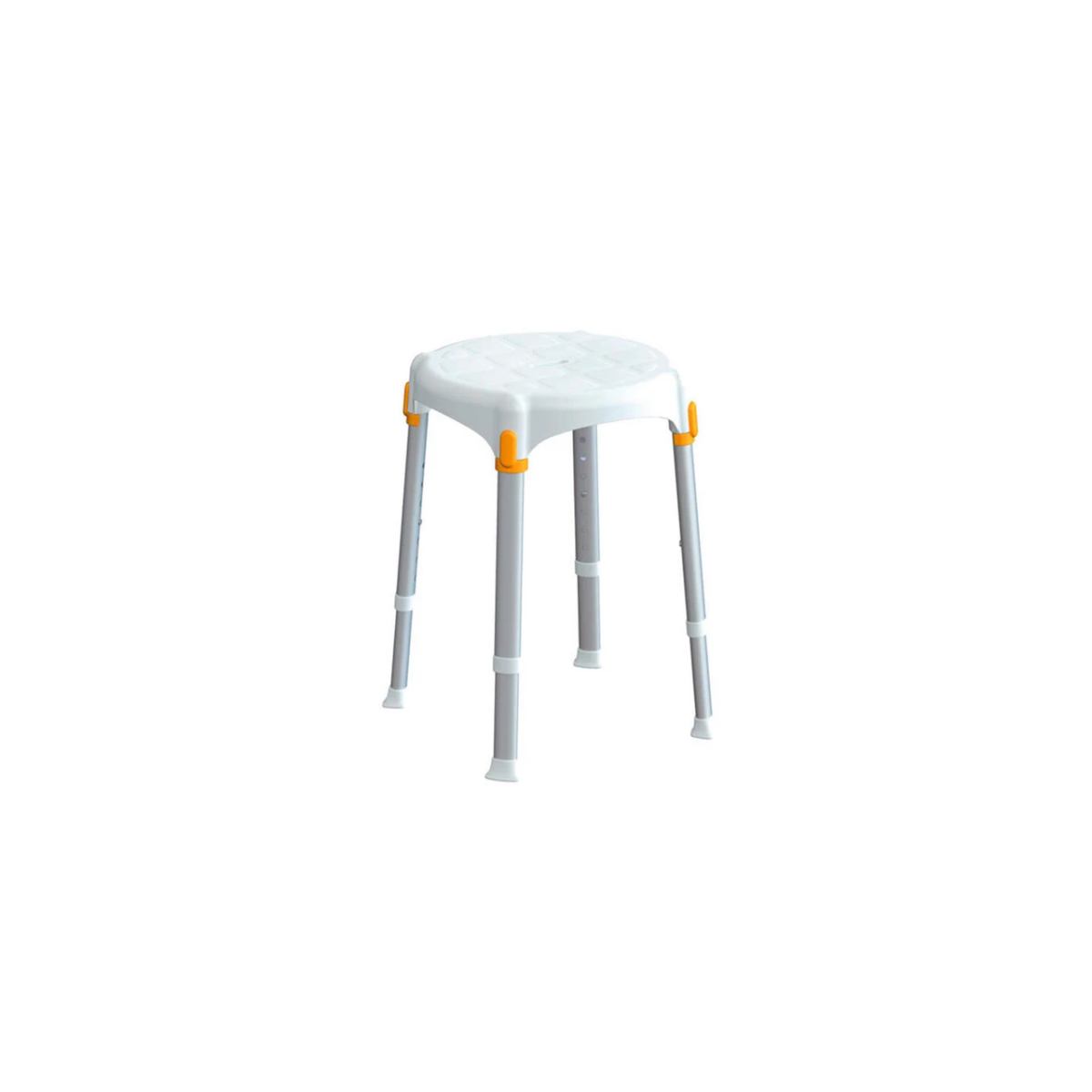 Taburete de ducha redondo de aluminio inoxidable regulable en altura.